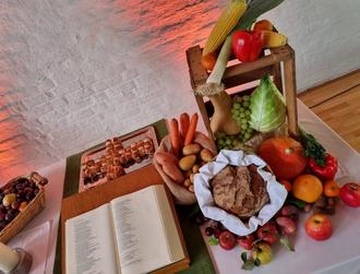 Am 27. September fand die Küken-Kirche im Herbst statt. Klein und Groß trafen sich in der Kirche, um gemeinsam Erntedank zu feiern. Bevor der eigentliche Gottesdienst anfing, lud eine Bastelstation zum Verweilen und Ankommen ein: Obst- und Gemüseausmalbilder konnten mit Seidenpapier beklebt oder mit Fingerfarbe bestempelt werden. Anschließend wurden sie auf einen Papierobstkorb geklebt. So entstand ein Erntedank-Körbchen "to go". Im Gottesdienst leitete ein farbenfroh gezierter Altar zum Thema über. Die Kleinen gingen in ihrer Predigt der Frage nach "Woher kommt eigentlich das Brot, das ich in der Bäckerei kaufen kann?" Für die Erwachsenen gab es den Impuls, das Selbstverständliche zu hinterfragen und auf die Suche nach dem "Dahinter" zu gehen. In den bunten Bastelstationen wurden Erntedank-Fensterbilder gestaltet, im Korken-Bad das genaue Hinschauen geübt, Danke-Obst beschriftet und einiges mehr! Natürlich wurde auch getanzt, gesungen und gelacht! Nach Gebet und Segen ging es in den gemütlichen Teil über. Dank vieler Kuchenspenden und Knabbereien konnten die Gottesdienstbesucher noch ein wenig länger die Gemeinschaft erleben und genießen, die diesen besonderen Gottesdienst ausmacht. Herzlichen Dank für die Spenden! Wir freuen uns auf die nächste Küken-Kirche zum Thema Advent am Samstag, den 22.11.2025.