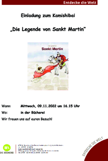 Die Legende von St. Martin fasziniert uns jedes Jahr wieder. In vielen Orten - auch in Rülzheim - wird am 11.11. dieser Tag gefeiert. Mit schönen Liedern begleiten die Kinder alljährlich den Darsteller dieses Heiligen auf seinem Pferd beim Umzug im Dorf. Auch wir wollen euch die Geschichte des Hl. St Martin erzählen und laden euch ein zu unserem Kamishibai am Mittwoch, den 09.11. um 16.15 Uhr in der Bücherei. Kommt vorbei, wir freuen uns auf euch.
