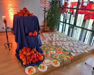 Das Erntedankfest der Küken-Kirche fand am 21. September statt und stand ganz unter dem Motto „danken und ernten“. Vor dem Gottesdienst konnten hierzu schon Papp-Kürbisse mit Hilfe von Papier und Kleister gestaltet werden. Außerdem brachten die Besucher*innen verschiedene Erntegaben von zu Hause mit und gestalteten so das Bodenbild des anschließenden Gottesdienstes mit. Im abwechslungsreichen und kurzweiligen Gottesdienst wurde von Pfarrerin Susanne Leingang die Geschichte ihres Apfelbaumes im Garten erzählt, der nach einigen Wochen „rote große Früchte“ (Äpfel) trug. Für die Erwachsenen gab es die „Erntedank in 5 Sätzen“ Predigt von Pfarrer Jan Meckler, die den Blick von der Feldernte auf die Familie lenkte. Dann wurden die Kids und ihre Begleiter*innen aktiv und kreativ. Sie konnten Bäume auf Jute-Taschen mit Textilfarben bestempeln, Tischgebets-Würfel basteln. Papieräpfel mit Dankworten beschriften/bemalen, Obstsalat für das Buffet schneiden oder den Dank der Eltern über ihre Geburt hören/erfahren (als kleine Massage). Zum Abschluss der Verkündigung wurden die gebastelten Äpfel ins Bodenbild gelegt – und zum Tausch ein echter Kürbis mitgenommen. Hier bedanken wir uns herzlich bei der Familie Ohmer aus Rheinzabern, die unsere Aktion mit der Spende von Kürbissen unterstützt hat. Nach gemeinsamen Fürbitt-Gebet und Vaterunser, sowie einem spürbaren Segen klang der Gottesdienst beim gemeinsamen Essen nach. Diesmal wurde passend zum Gottesdienst von Familie Leingang vorab eine Kürbissuppe gekocht. Diese und auch die leckeren Kuchenspenden wurden von Groß und Klein gerne verspeist. An dieser Stelle ein herzliches Dankeschön an Familie Hartenstein, die die Schriftzüge für die Jute-Taschen gestiftet haben! Und ein herzliches Dankeschön an alle Teammitglieder, die den Gottesdienst mit viel Engagement und Herzblut vorbereiten! Es zeigt sich immer wieder: Damit Kirche sichtbar wird, braucht es ein „Wir“! Wenn du Lust hast uns zu unterstützen – im Vorbereitungsteam, durch Backen von Kuchen-/Gebäckspenden, durch Sach-/Geldspenden - freuen wir uns, wenn du Kontakt zum Pfarramt aufnimmst. Der nächste Gottesdienst findet am Samstag, 30.11.24 statt. Das Thema ist „Advent“. Wir freuen uns auf euch und wünschen einen schönen Herbst!