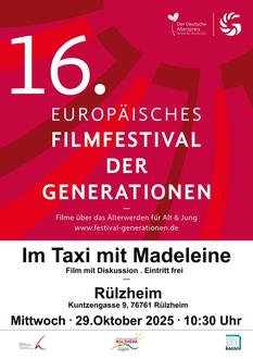 Bereits zum sechzehnten Male findet in der Metropolregion Rhein-Neckar das Europäische Filmfestival der Generationen unter Leitung von Gerontologe Dr. Michael Doh/Universität Heidelberg statt. In diesem Jahr nimmt der Südpfalz-Tourismus Verbandsgemeinde Rülzheim e.V. zum zehnten Mal an dieser Veranstaltung teil. Im Rahmen der Festivalwoche, die sich in Rülzheim dem Thema Dialog, Frauenbilder im Wandel der Zeit widmet, wird am Mittwoch, den 29. Oktober 2025, ab 10:00 Uhr vormittags im Centrum für Kunst und Kultur der Kinofilm „Im Taxi mit Madleine“ gezeigt. Erstmals nimmt die IGS Rülzheim unter der Leitung von Daniela Johannes und Rahel Rohrmoser an der Veranstaltung teil und gestaltet mit den Schüler und Schülerinnen der Klassenstufe 11 und 12 die spannende Diskussionsrunde im Anschluss an den Film. Durch die Veranstaltung führen Theo Dreyer, Beigeordneter für Tourismus- und Wirtschaftsförderung und Dr. Birgitta Hartenstein, zuständig für Senioren und Teilhabe. Wir freuen uns auf Ihre Teilnahme und anregende Gespräche! Hinweis: Wir bitten um Anmeldung für die Veranstaltung online unter www.suedpfalztourismus-ruelzheim.de/Erlebnisse oder im Tourismusbüro im Rathaus in Rülzheim bis zum 26. Oktober 2025 bei Petra Becker, Telefon 07272 7002 1068 oder per Email p.becker@ruelzheim.de Zum Film: Line Renaud bei Dreharbeiten 93 Jahre alt, spielt eine alte Dame, die sich nach einem letzten Blick auf ihr Haus in einem Vorort, mit dem Taxi quer durch Paris in eine Seniorenresidenz chauffieren lässt. Ihr Fahrer Charles ist so gestresst, dass er kaum ein Wort hervorbringt. Doch der liebenswürdigen Madeleine gelingt es, ihn aus der Reserve zu locken. Spontan bittet sie ihn, einige Stationen ihrer Vergangenheit abzufahren. Noch einmal möchte sie jene Orte sehen, die wichtig waren in ihrem Leben. Charles, anfangs verärgert und mürrisch, fährt los. Mit jedem Stopp entfaltet sich die erstaunliche Lebensgeschichte von Madeleine, deren persönliches Schicksal eng verbunden ist mit dem gesellschaftlichen Frauenbild der jeweiligen Epoche. Charles ist zunehmend berührt und beginnt seinerseits von seinen Nöten zu erzählen. Aber Madeleine wäre nicht Madeleine, wenn sie nicht mit ihrem Sinn für Humor und ihrer Lebensklugheit den einen oder anderen Rat für Charles hätte. Was wie eine normale Taxifahrt beginnt, entwickelt sich zu einer tiefgründigen Begegnung zweier Generationen – und zu einer Reise zu sich selbst.
