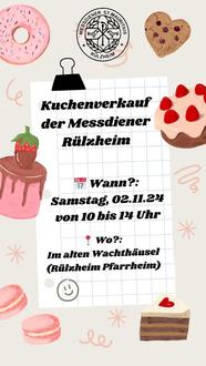 Die Messdiener Rülzheim veranstalten am 02.11.2024 einen Kuchenverkauf von 10 bis 14 Uhr. Im alten Wachthäusel (Eingang zur Mittleren Ortsstraße) verkaufen wir leckere Kuchen, Torten und Muffins. Über Kuchenspenden freuen wir uns sehr. Falls sie uns einen Kuchen backen möchten, können sie diesen am 02.11. gegen 9:30 vorbeibringen. Der Erlös des Kuchenverkaufs wird für Freizeiten und Aktivitäten unserer Gruppe verwendet. Wir freuen uns über Ihren Besuch.