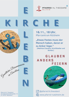 Herzliche Einladung zu unserem neuen Gottesdienstformat „Kirche erleben, Glauben anders feiern“. Wir wollen mit diesem neuen Format einen Gottesdienst der anderen Art feiern, der Alltagsthemen und -fragen mit unserem Glauben verbindet. Seinen Sie gespannt auf diese neue Form. Ganz herzlich laden wir alle Teilnehmenden im Anschluss zu einem gemütlichen Beisammensein ein. Am 16. November findet der erste Gottesdienst dieser Art um 18.00 Uhr im kath. Pfarrzentrum in Rülzheim statt. Thema ist die Frage: Woran kann ich mich festhalten? Im Strom unserer Zeit fühlen wir uns oft wie in einem Schlauchboot. Wir können uns dem Gefühl nicht entziehen: Die Stromschnellen werden immer stärker, die Geschwindigkeit nimmt zu. Wo ist der Griff zum Festhalten? Wo finden wir etwas Bleibendes, wenn es wacklig wird in unserem Leben? Wir benötigen einen Halt, an dem wir uns festmachen und worauf wir unser Leben bauen können. Lassen Sie uns gemeinsam in dieser Wort-Gottes-Feier einen Anker entdecken, der es uns auch in stürmischen Zeiten ermöglicht, einen festen und sicheren Halt zu finden.