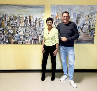 Das Foto zeigt die Ausstellerin mit Bürgermeister Matthias Schardt vor einigen Ihrer Bilder.