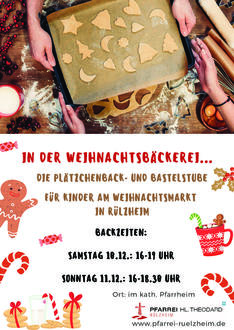 Herzliche Einladung für alle Kinder zur Weihnachtsplätzchenback- und Bastelstube während des Weihnachtsmarktes in Rülzheim. Fleißige Hände unserer Pfarrei unterstützen die Kinder beim Backen oder Basteln, sodass später Leckereien und fertige Basteleien mit nach Hause genommen werden können. Große Kinder können allein an der Aktion teilnehmen, bei kleinen Kindern (Kindergartenalter) bitten wir um die Unterstützung der Eltern. Falls Sie uns bei dieser Aktion unterstützen möchten (durch Mithilfe während der Backzeiten oder durch eine Teigspende) melden Sie sich gerne bei PA Annika Bär (Annika.baer@bistum-speyer.de)