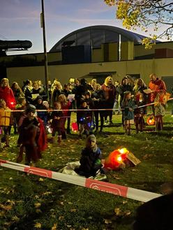 Als es so langsam dunkel wurde, trafen wir uns an einem Mittwoch (10. November) mit Mama´s, Papa´s, Oma´s, Opa´s und mit unseren Erzieher/innen am großen Baum auf dem Kitagelände. Angeführt vom „St. Martin“ auf seinem Pferd, machten wir uns Alle mit unseren selbstgestalteten, strahlenden Laternen auf den Weg in Richtung Straußenfarm. Zwischendurch wurde immer mal wieder eine Pause gemacht, um gemeinsam Laternenlieder zu singen. Natürlich durfte das St. Martin´s Spiel ganz am Ende nicht fehlen. Den eindrucksvollen Abend ließen wir mit warmen Getränken, Kuchen und heißen Würstchen ausklingen. Ein herzliches Dankeschön geht an den „St. Martin“, an die musikalische Untermalung durch Musiker vom Rülzheimer Musikverein und an die helfenden Hände des Elternausschusses. Es grüßen herzlich die Zauberwaldkinder mit Ihren Erzieher/innen
