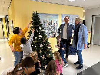 Kinder der KiTa „Sonnenschein“ in Rülzheim haben vergangene Woche den Christbaum im Foyer des Rathauses geschmückt. Bürgermeister Matthias Schardt bedankte sich bei den Kindern und Erzieherinnen und übergab ein kleines Präsent.