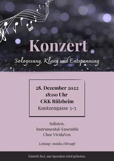 60 Minuten voller schöner Musik und emotionalen Klängen. Das erwartet Sie am 28. Dezember 2022 im Zentrum für Kunst und Kultur, Rülzheim. Das Instrumental-Ensemble bestehend aus Laureen Mobo (Gesang), Jurij Espenschied (Schlagzeug), Luis Halter (Cello), Darja Kuklinski (Gitarre) und Annika Dörzapf (Klavier), wird Sie in eine Welt entführen, in der es Raum gibt, sich wieder auf sich selbst rückzubesinnen und zu entspannen. Der Chor VividaVox unter der Leitung von Heinz Kern wird das Programm mit mehrstimmigen Klängen bereichern und durch eine kleine Meditation von Alina Möhlmann werden Sie noch tiefer in die Welt der Entspannung geführt. Freuen Sie sich auf ein abwechslungsreiches und schönes Konzert. Der Eintritt ist frei. Um Spenden wird gebeten, um weitere Musikprojekte zu unterstützen.