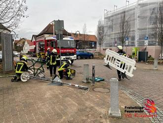 Die Leitstelle alarmierte uns zu einer umgefahrenen Laterne. Vor Ort stellte sich heraus, dass ein LKW in einem Stahlseil hängen blieb, welches an drei Laternen befestigt war. Die EVU war ebenfalls vor Ort und schaltete die beschädigten Laternen stromlos, diese wurden dann von uns abmontiert. Ebenfalls wurden die Laternenpfosten gegen Spritzwasser geschützt und Warnbarken aufgestellt. Außerdem vor Ort war der Bauhof Rülzheim, der ein provisorisches Straßenschild anbringen musste.