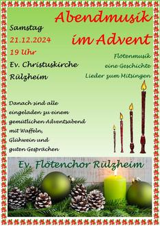 Bald ist es wieder soweit - Weihnachten steht vor der Tür. Wir laden Sie ein, innezuhalten, zur Ruhe zu kommen, einer besinnlichen Geschichte zu lauschen, Musik zu genießen, Lieder mitzusingen und im Anschluss bei Glühwein und Waffeln miteinander ins Gespräch zu kommen. Wir freuen uns, Sie am Samstag, 21.12.2024 um 19 Uhr in der Ev. Christuskirche in Rülzheim zu begrüßen.