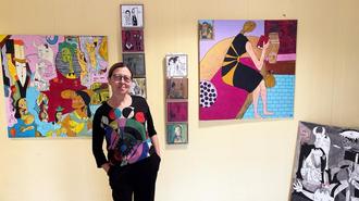 Das Foto zeigt die Ausstellerin vor einigen ihrer Werke.