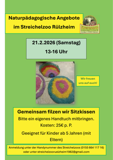 Am Samstag, den 21.02.2026 von 13:00 - 16:00 Uhr filzen wir gemeinsam Sitzkissen. Das Angebot ist für Kinder ab 5 Jahren in Begleitung der Eltern geeignet und kostet 25 € p. P.. Bitte ein Handtuch mitbringen. Am 22.02. von 14:00 - 16:00 Uhr erkunden wir die Vogelwelt des Streichelzoos, basteln Vogelhäuschen und Anhänger mit Vogelfutter (ab 6 Jahren, 15 € p. P.). Anmeldungen nehmen wir unter der Handynummer des Streichelzoos (0155 66411716) oder per E-Mail an streichelzooruelzheim1982@gmail.com entgegen. Wir freuen uns auf eure Teilnahme!