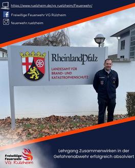 Vom 09.-13.02.2026 besuchte Dr. Jens Dudenhöffer, Zugführer in der Einheit Rülzheim, den Lehrgang "Zusammenwirken in der Gefahrenabwehr" am Landesamt für Brand- und Katastrophenschutz Rheinland-Pfalz (LfBK) in Koblenz. Inhalt des Lehrgangs war die Führungsdienstrichtlinie Rheinland-Pfalz (FüRi), welche u. a. bei Großschadensereignissen angewendet wird. Solche Einsatzlagen erfordern den Einsatz und die Koordination verschiedener Fachdienste zusätzlich zur Feuerwehr. Einsatzwert, Aufgaben, Organisation und die Zusammenarbeit mit den Rettungsdiensten, Bundespolizei, Landespolizei, Bundeswehr, DLRG, THW, Energieversorgern und der Deutschen Bahn waren die weiteren Inhalte. Zusätzlich wurde auf die Möglichkeiten der Psychosozialen Notfallversorgung (PSNV), die Organisation des Einsatzes nach Alarm- und Einsatzplänen und die Presse- und Medienarbeit eingegangen.