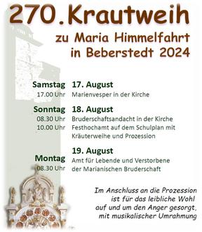 | +20.SONNTAG i.J. Koll. f. Orgel | 17.08.2024 18.08.2024 | 17.00 Uhr Marienvesper 08.30 Uhr Bruderschaftsandacht 10.00 Uhr Wallfahrtshochamt zur 270. Krautweih in Beberstedt mit Weihbischof Dr. Karlheinz Diez aus Fulda | ||
