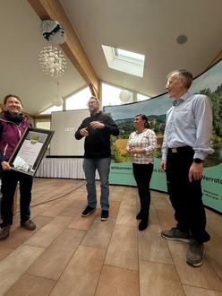 Liane Jordan (Deutscher Wanderverband) gratulierte zur erneuten Zertifizierung. Matthias Fahrig von der Stadt Leinefelde-Worbis und Stefanie Strecker von der Stadt Dingelstädt nahmen die Urkunde entgegen. Uwe Müller (Naturpark EHW) gratulierte ebenfalls. (Namen von links nach rechts)