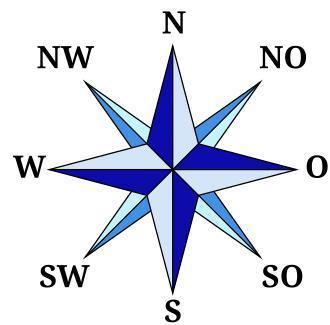 Die wichtigsten Himmelsrichtungen - man nennt dieses Bild auch „Windrose“. N steht zum Beispiel für Norden, NW für Nordwesten und NO für Nordosten.