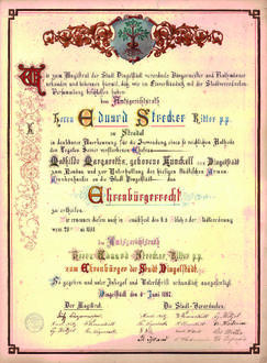 In der Stadt Vreden im Münsterland fand der ehemalige Leiter des Stadtarchivs Vreden, Herr Hubert Krandick, bei einer Haushaltsauflösung eine Urkunde über die Verleihung des Ehrenbürgerrechts durch die Stadt Dingelstädt am 6. Juni 1887 an den Amtsgerichtsrat Eduard Strecker. Da diese Urkunde für die Stadt Vreden nicht interessant ist, bot er diese Urkunde unserer Stadt Dingelstädt an.
