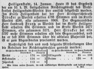 Wahlergebnis der Reichstagswahl am 10.1.1874 in den „Eichsfelder Volks-Blätter“ vom 22.1.1874