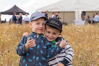 Lieven Jakobshagen und Marlon Werkmeister freundeten sich als zukünftige Nachbarn schon einmal an. Mit ihnen und ihren Eltern zieht jetzt Leben ins Wohnbaugebiet ein (v.l.n.r).