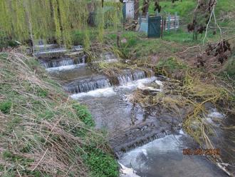 Die Höhendifferenz des Absturzes beträgt ca. 1 m. Die Sohle wird mittels einer Schüttung aus Wasserbausteinen mit gewundener Mittelwasserrinne hergestellt. Die marode östliche Ufermauer wird auf ihrer gesamten Länge abgebrochen und die dadurch entstehende neue Böschung mit Wasserbausteinen gesichert. Im Kontaktbereich der Brücke werden vor dem Gebäude Steingabionen angeordnet.