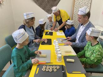 Mädchen und Jungen der AG Kochen der Grundschule "Am Erlbach" Kraftsdorf trafen sich wenige Tage vor Heiligabend zum Plätzchenbacken mit Küchenmeister Harald Saul und Landrat Dr. Ulli Schäfer. Den Kindern bereitete das Zubereiten des leckeren Backwerks sichtbar Spaß - auch zur Freude von Schulleiterin Nicola Nickel. Die Koch AG ist eine von sechs Arbeitsgemeinschaften. "Es ist wichtig, dass die Kreativität der Schülerinnen und Schüler auf so lebensnahe Weise gefördert wird", meint Landrat Dr. Schäfer.