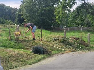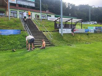 Die Mammutarbeit nahm natürlich das Mähen des hohen Grases am Hang zum Sportheim in Anspruch, wofür auch die meisten Helfer gebraucht wurden. Wie beim letzten Einsatz mussten auch diesmal wieder zahlreiche Büsche und die große alte Linde auf der Bachseite verschnitten werden. Am Anstieg zum Sportheim wurden der alte Drahtzaun und vier alte Betonsäulen entfernt.