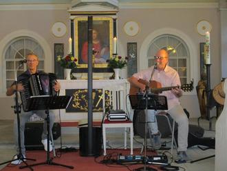 Das Markenzeichen der beiden Künstler sind unbestritten deutsche und internationale Rock- und Popballaden sowie ruhige Songs mit Tiefgang. Aus diesem umfangreichen Repertoire hatten sie für ihr fast zweistündiges Konzert in unserer Kirche St. Peter und Paul viele wunderschöne bekannte und weniger bekannte Titel ausgewählt. Den Auftakt bildete „Here comes the sun“ von den Beatles, ein Song, der wunderbar zum Sonnenschein dieses schönen Sonntags passte. Es folgten unverwechselbare irische Folksongs, die mit ihren fröhlichen Melodien immer wieder Schwung und gute Stimmung garantieren. Das trifft besonders zu, wenn die Musiker neben ihren Hausinstrumenten Akkordeon und Gitarre auch mal Mandoline und Mundharmonika meisterhaft erklingen lassen.