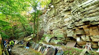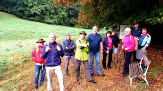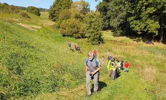 Am Sportplatz begann die Wanderung an diesem sonnigen Herbsttag in Richtung Kirchtal zur „Hubertusquelle“, vorbei an jahrhundertelang bestehenden Sandsteinbrüchen. Der „Kraftsdorfer Sandstein“ wurde früher zum Bauen viel verwandt, privat und industriell, sogar für Teile der Pfeiler der weltberühmten Göltzschtalbrücke.