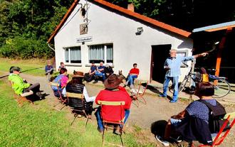 Weiter in Richtung Kraftsdorf “In den Erlen“ bogen wir dann rechts ab und der Hundesportplatz “Mückenstich“ war unser Ziel. Hier erwarteten uns weitere Flurzugteilnehmer und der Reichenbacher Ortschronist, Herr Andreas Rosenkranz, der uns von der Geschichte unseres Nachbarortes und seiner Beziehung zu Kraftsdorf mit seinem Bahnhof berichtete.