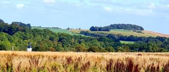 Dort, an der ehemaligen Fuchsmühle, Herr Bräuner zeigte uns hier an Ort und Stelle alte Fotos von der einst abgebrannten Mühle, liefen wir vorbei und der Weg setzte sich entlang des „Fuchsgrundes“ bis hoch zum „Martinsholz“ fort. Es war ein großartiger Blick zum „Tümmelsberg“, der höchsten Erhebung (361 m) in unserer Gegend, neben der Bundesautobahn A 4 und der Kraftsdorfer Kirchturmspitze.