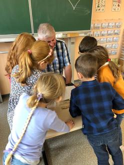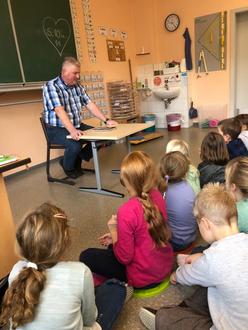 Erstmals liest der Bürgermeister Becker in der Grundschule „Am Erlbach“ in Kraftsdorf vor. Die ersten Klassen freuten sich, dass sie mit ihm zusammen Kriminalfälle der drei Fragezeichen lösen konnten.