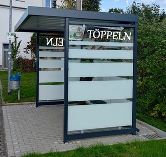 Last but not least auch danke an den Heimatverein für die Organisation der Beklebung der beiden Glaspavillons mit dem Schriftzug „Töppeln“ und dem stilisierten Logo aus der historischen Töppelner Schwengelpumpe, dem Zusammenfluss von Saar- und Erlbach und dem Blatt einer Erle mit Zapfen.