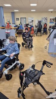 Das kleine Highlight zum Schluss bildete eine Probefahrt auf diversen Rollstühlen oder Rollatoren entweder mit Handbetrieb oder elektrobetrieben via Joystick, die zeigte, wie herausfordernd doch eine Lebensweise sein muss, bei der ein solches Hilfsgerät unverzichtbar ist.