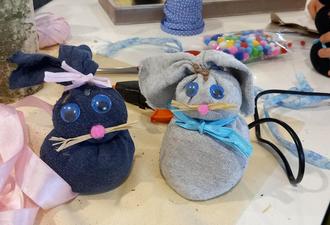 Gestärkt konnten wir uns nun dem „Sockenhase“ zuwenden. Hier wurde eine Socke mit Reis gefüllt und zugebunden. Auch diese wurden sehr kreativ gestaltet.