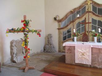 In allen drei Kirchen wurden die großen Holzkreuze in den Altarräumen mit frischen Blumen durch die zahlreichen Besucher geschmückt.