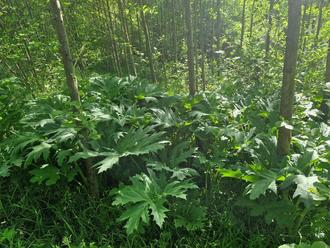 Der Riesenbärenklau, auch Herkulesstaude genannt, stellt aufgrund seiner Gefährdung der menschlichen Gesundheit und der heimischen Natur sowie seiner inzwischen weiten Verbreitung eine der bekanntesten invasiven gebietsfremden Pflanzenarten in Thüringen dar. Gefahr besteht bei Hautkontakt mit allen Pflanzenteilen (Blüten, Stängel, Blätter, Wurzel, Samen) und dem Pflanzensaft. Aufgrund der darin enthaltenen phototoxischen Giftstoffe können bei gleichzeitigem Kontakt mit Sonnenlicht brennende und juckende Hautrötungen oder gar schmerzhafte, wässrige Blasen und Ödeme entstehen, die mit Verbrennungen vergleichbar sind. In solchen Fällen muss unbedingt eine ärztliche Behandlung erfolgen.