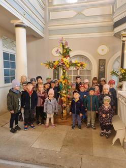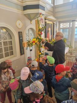 Ein besonders schöner Moment war die Osterandacht in der Kirche. Gemeinsam mit den Kindern, den Erziehern und dem Pfarrer, wurde das Kreuz mit selbst mitgebrachten Blumen geschmückt - ein farbenfrohes Zeichen der Hoffnung und des Lebens. Ein herzlicher Dank geht an alle Eltern und Kinder, die diese schönen bunten Blumen mitgebracht haben.