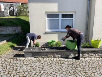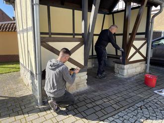 Den Dorfplatz befreiten wir von Unkraut, die Holzbalken der Buswartehäuschen wurden mit Farbe versehen und die Blumenrabatte dort brachten wir wieder auf Vordermann.