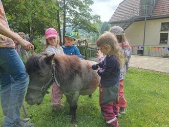 Zum Kindertag überraschten wir Erzieherinnen die Kinder. Der Streichelzoo des Tierparks Gera besuchte uns am Vormittag. Plötzlich hatten wir Hasen, Meerschweinchen und Ponys zum Anfassen, Streicheln oder Füttern im Garten stehen.