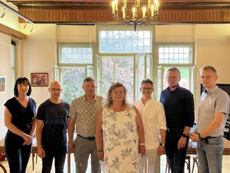 von links nach rechts: Babette Sterna, Marko Seidemann, Bürgermeister Oliver Voigt, neue DRK-Ortsvorsitzende von Bad Köstritz Kathrin Fröhlich, Kassenwart Paul Wünsche, Stellvertretender Vorsitzender Björn Köhler und der Präsident des DRK Kreisverbandes Landkreis Greiz Dr. Ulli Schäfer