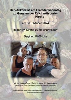 | Erntedankbenefizkonzert zu Gunsten der Reichardtsdorfer Kirche mit der Heger-Band (Geistl. Impuls: U. Kaselowsky) |