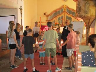 Wieviel Zeit uns auf Erden vergönnt ist, wissen wir nicht. Zum großen Teil besteht unsere Lebenszeit aus Arbeit und Pflichten, aber wir brauchen auch Zeit für Ruhe und Erholung, um uns zu stärken und neue Kraft zu schöpfen, so Pfarrer Kurzke. Deshalb bat er zum Schluss des Gottesdienstes alle Schulanfänger, Schüler, Konfirmanden und Vorkonfirmanden nach vorn in den Altarraum und segnete sie für die Anforderungen des neuen Schuljahres. Auch die gesamte Gemeinde empfing Gottes Segen für den Sonntag und die neue Woche, wie es in jedem Gottesdienst üblich ist. Auf diese Weise wunderbar gestärkt konnten alle wieder in ihren Alltag starten. Das folgende Abschlusslied vermittelte ebenfalls diese frohe Botschaft, in dem es heißt: Halte zu mir, guter Gott, heut‘ den ganzen Tag, halt‘ die Hände über mich, was auch kommen mag.