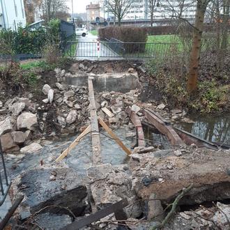 Das Foto zeigt den Zwischenzustand während des Abbruchs, vor der Beräumung von Bachbett und Böschung.