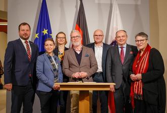 Von links: Onno Eckert (Landrat des Landekreises Gotha), Michaela Barchevitch (Geschäftsführende Intendantin der Thüringen Philharmonie Gotha-Eisenach), Eisenachs Oberbürgermeisterin Katja Wolf, Prof. Dr. Benjamin-Immanuel Hoff (Chef der Thüringer Staatskanzlei und Minister für Kultur, Bundes- und Europaangelegenheiten), Udo Schilling (Erster Kreisbeigeordneter des Wartburgkreises), Gothas Oberbürgermeister Knut Kreuch sowie Gabriele Reichstein (Vorsitzende der Gesellschaft der Freunde und Förderer, Thüringen Philharmonie Gotha-Eisenach).