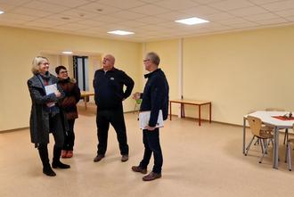 Oberbürgermeisterin Katja Wolf (v.l.), Manuela Hoppe vom Fachgebiet Hochbau, Schulleiter Jens Krumbholz und Bernd Wächter, Fachdienstleiter Schulverwaltung, bei der Begehung der neuen Räumlichkeiten.