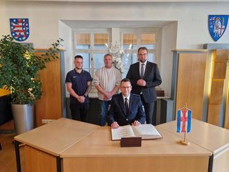 Eintrag ins Goldene Buch: Daniel Berg (von links), Jens Armstroff und Hartmut Kellner trugen sich ins Goldene Buch der Stadt Eisenach ein. Oberbürgermeister Christoph Ihling würdigt damit ihren Einsatz zur Rettung von Menschenleben.
