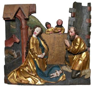 Ein mittelalterliches Altarbild zeigt Maria, Josef, das Jesuskind und die Hirten im Stall. Relief des Waltershäuser Altars, Leihgabe der Evangelischen Kirchengemeinde Waltershausen