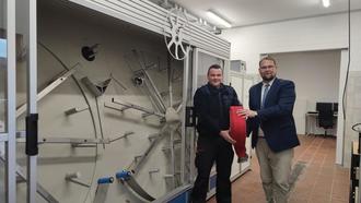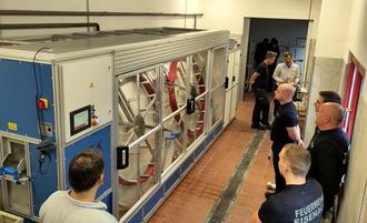 Stephan Fischer, stellv. Leiter der Berufsfeuerwehr zeigt OB Ihling das neue Schlauchpflegezentrum