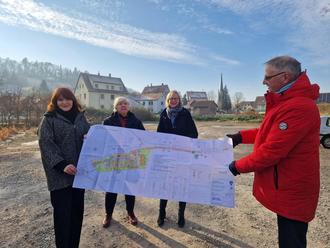 V. l. n. r.: Staatssekretärin Dr. Katja Böhler,Orsteilbürgermeisterin Gisela Büchner, Oberbürgermeisterin Katja Wolf und Andreas PeterJaszbereny, Fachdienstleiter Tiefbau.