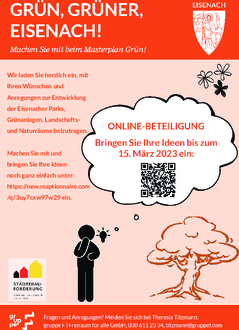Wir laden Sie herzlich ein, Ihre Wünschen und Anregungen zur Entwicklung der Eisenacher Parks, Grünanlagen, Landschafts- und Naturräume noch bis zum oben genannten Termin einzubringen.