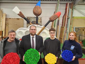 Das Streitgespräch zwischen Sommer und Winter ist legendär, der Umzug selbst lange vorbereitet. In diesem Jahr ist es am 29. März soweit. Das Frühlingsfest steht unter dem großen Motto „Seltenes Handwerk in Thüringen“. Oberbürgermeister Christoph Ihling freut sich über diese Themenauswahl, die selten gewordenen Berufen eine ungeahnte Aufmerksamkeit verschafft. Bei einem Besuch bei der Sommergewinnszunft durfte er vorab in der Wagenhalle einen Blick auf einige der Festwagen erhaschen. Am neu zu gestaltenden Wagen „die Malerpalette“ schaute er Thor Kummert über die Schultern